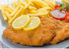 (Chivito uruguayo) churrasco, jamón, mozzarrella, panceta ahumada, pimientos asados, aceitunas, palmitos, acompañado con papas fritas, rusa, lechuga y tomate