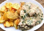 panceta, cebolla y marsala, crema, aros de cebolla, morrones y papas españolas